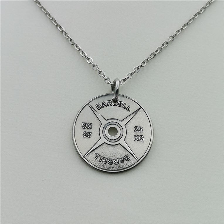 Stainless steel dumbell pendant with 45cm chain.